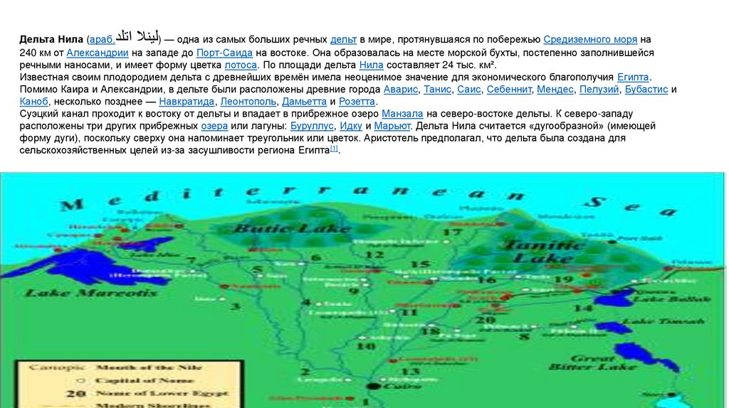расположены три других прибрежных озера или лагуны: Буруллус, Идку и Марьют. Дельта Нила считается «дугообразной» (имеющей