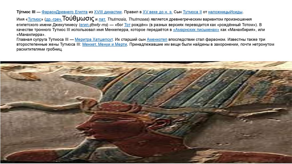 Ту́тмос III — ФараонДревнего Египта из XVIII династии. Правил в XV веке до н. э. Сын Тутмоса II от наложницыИсиды.