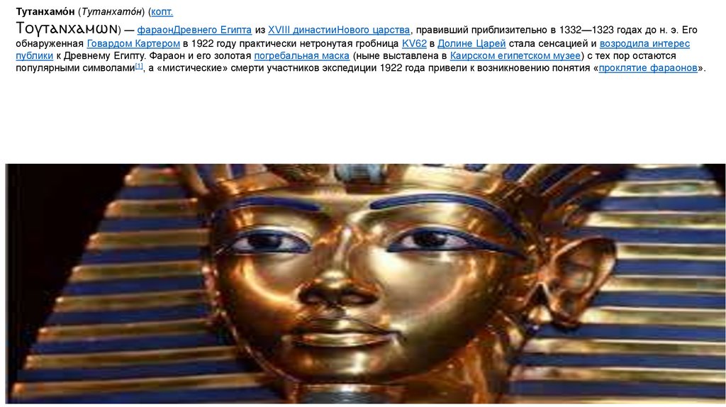 Тутанхамо́н (Тутанхато́н) (копт.Ⲧⲟⲩⲧⲁⲛⲭⲁⲙⲱⲛ) — фараонДревнего Египта из XVIII династииНового царства, правивший приблизительно в 1332—1323 годах до н. э. Его