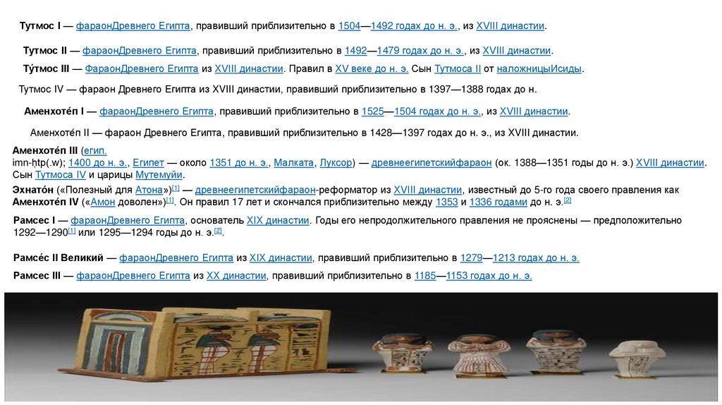 Тутмос I — фараонДревнего Египта, правивший приблизительно в 1504—1492 годах до н. э., из XVIII династии.Тутмос II — фараонДревнего Египта, правивший приблизительно в 1492—1479 годах до н. э., из XVIII династии.