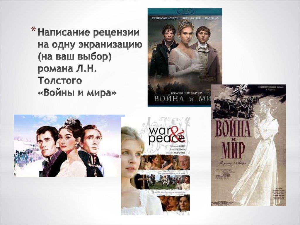 Написание рецензии на одну экранизацию (на ваш выбор) романа Л.Н. Толстого «Войны и мира»