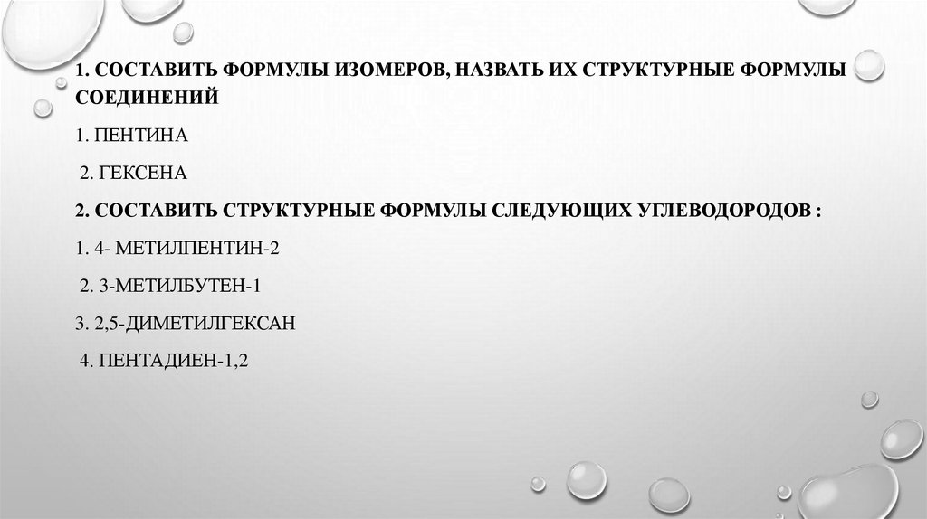 1. СОСТАВИТЬ ФОРМУЛЫ ИЗОМЕРОВ, НАЗВАТЬ ИХ СТРУКТУРНЫЕ ФОРМУЛЫСОЕДИНЕНИЙ