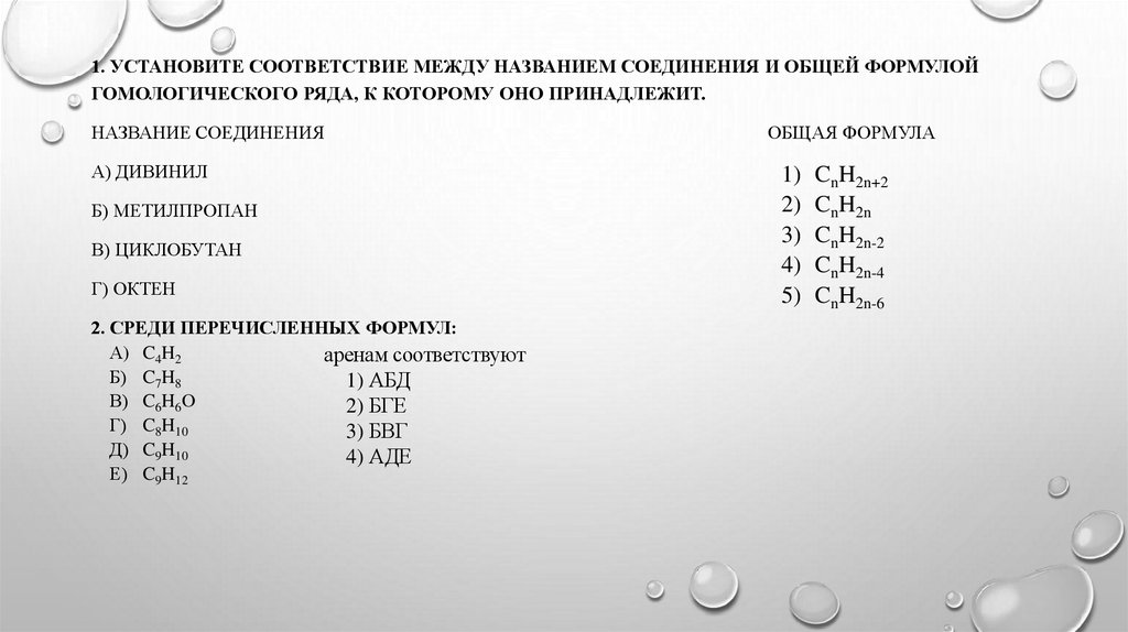 1. УСТАНОВИТЕ СООТВЕТСТВИЕ МЕЖДУ НАЗВАНИЕМ СОЕДИНЕНИЯ И ОБЩЕЙ ФОРМУЛОЙГОМОЛОГИЧЕСКОГО РЯДА, К КОТОРОМУ ОНО ПРИНАДЛЕЖИТ.
