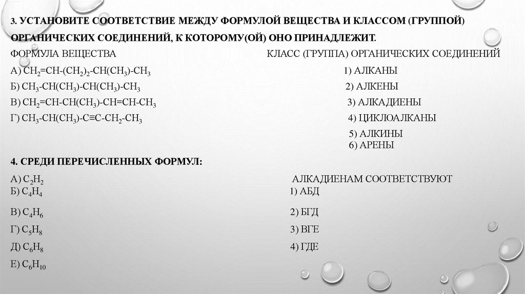 3. УСТАНОВИТЕ СООТВЕТСТВИЕ МЕЖДУ ФОРМУЛОЙ ВЕЩЕСТВА И КЛАССОМ (ГРУППОЙ)ОРГАНИЧЕСКИХ СОЕДИНЕНИЙ, К КОТОРОМУ(ОЙ) ОНО ПРИНАДЛЕЖИТ.
