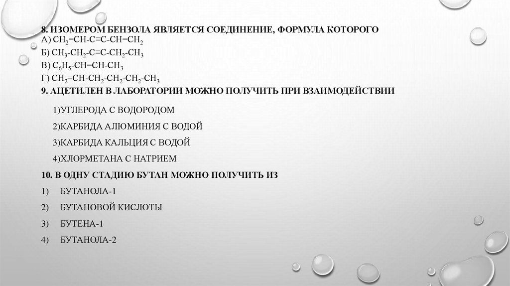 8. ИЗОМЕРОМ БЕНЗОЛА ЯВЛЯЕТСЯ СОЕДИНЕНИЕ, ФОРМУЛА КОТОРОГОА) СН2=СН-С≡С-СН=СН2