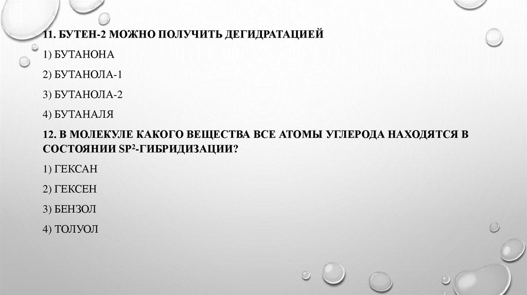 11. БУТЕН-2 МОЖНО ПОЛУЧИТЬ ДЕГИДРАТАЦИЕЙ1) БУТАНОНА