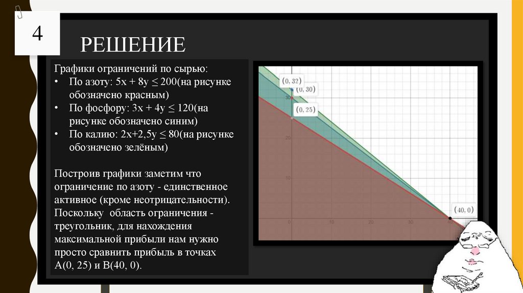 • По калию: 2x+2,5y ≤ 80(на рисунке