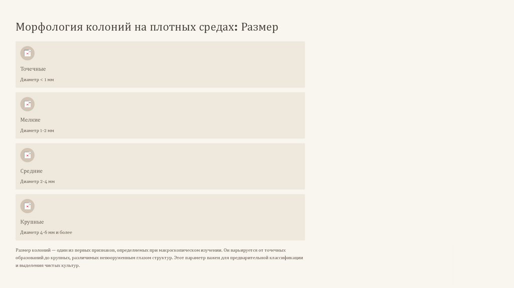 Размер колоний — один из первых признаков, определяемых при макроскопическом изучении. Он варьируется от точечных