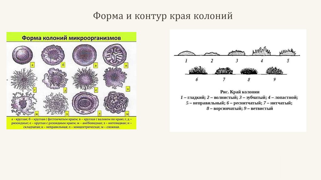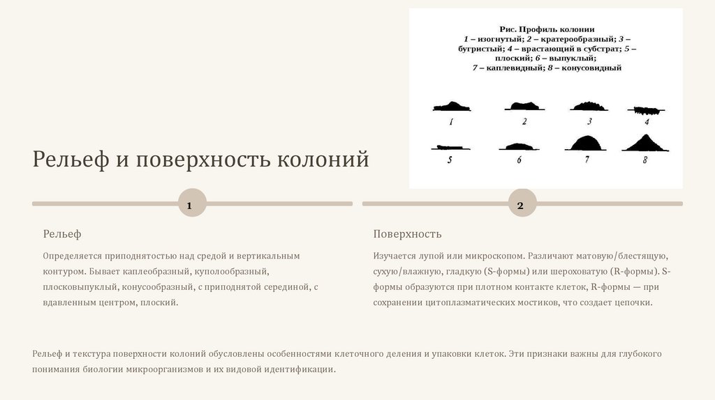 Рельеф и текстура поверхности колоний обусловлены особенностями клеточного деления и упаковки клеток. Эти признаки важны для глубокого