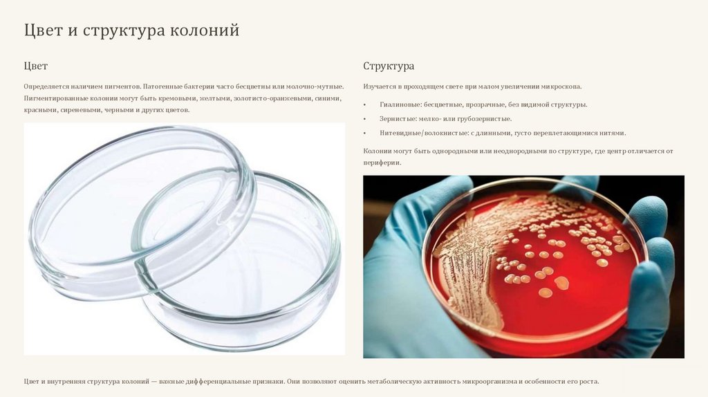 Цвет и внутренняя структура колоний — важные дифференциальные признаки. Они позволяют оценить метаболическую активность микроорганизма и особенности его роста.