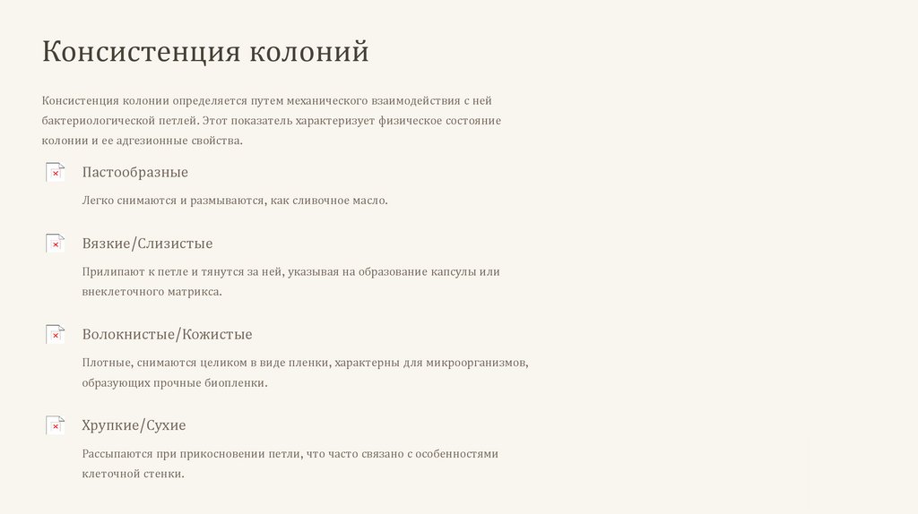 Консистенция колонийКонсистенция колонии определяется путем механического взаимодействия с ней