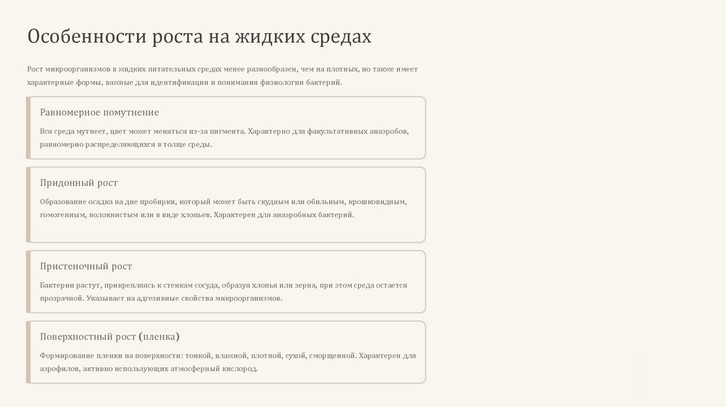Особенности роста на жидких средахРост микроорганизмов в жидких питательных средах менее разнообразен, чем на плотных, но также имеет