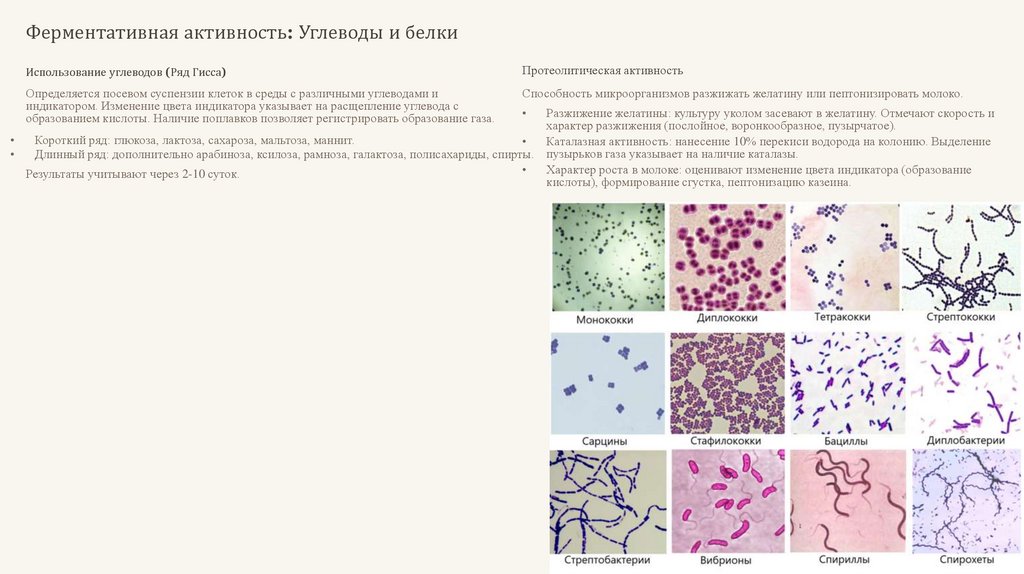 Ферментативная активность: Углеводы и белкиИспользование углеводов (Ряд Гисса)