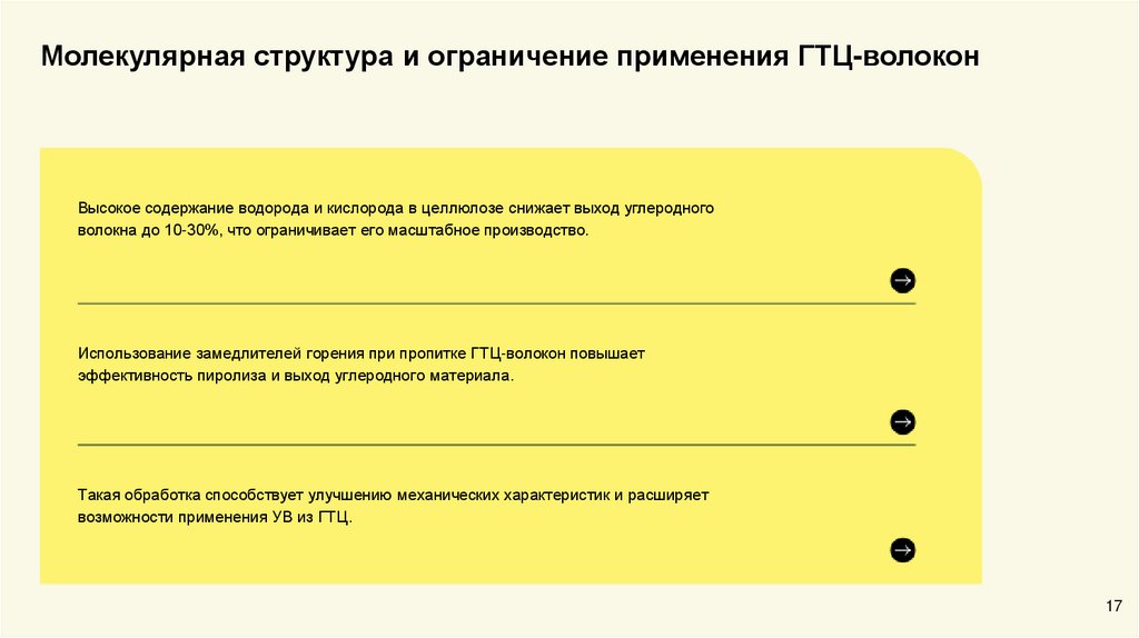 Молекулярная структура и ограничение применения ГТЦ-волоконВысокое содержание водорода и кислорода в целлюлозе снижает выход углеродного