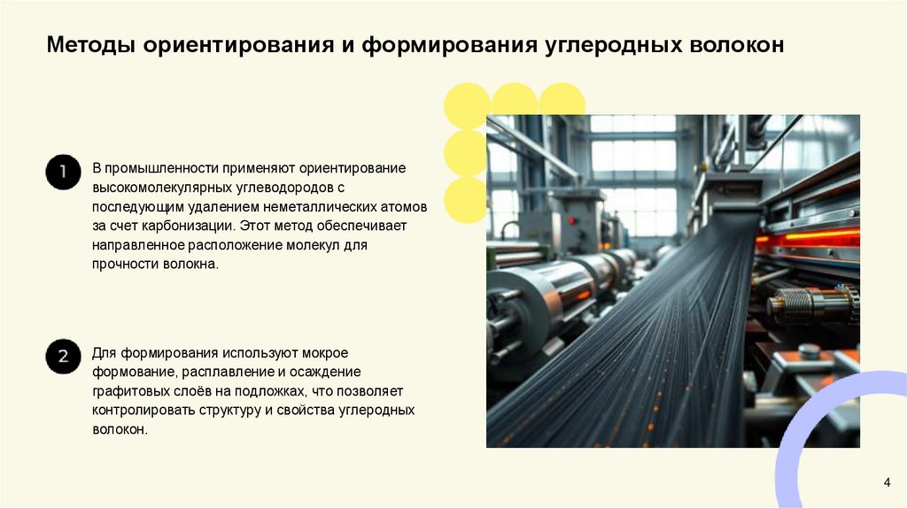 Методы ориентирования и формирования углеродных волоконВ промышленности применяют ориентирование