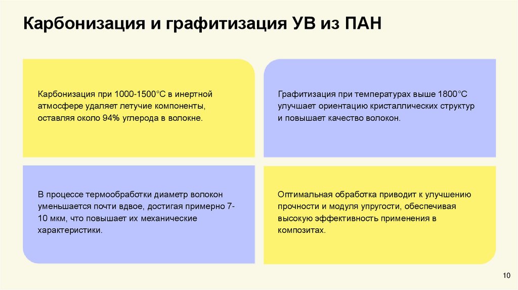 Термообработка при 2800-3000°С с одновременным вытягиванием для повышения модулей упругости.