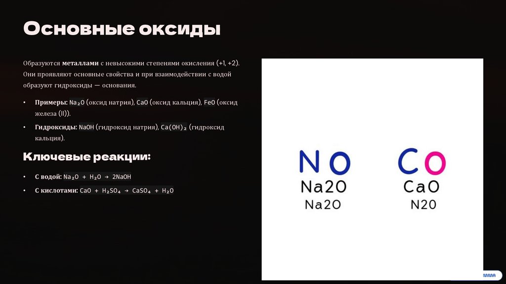 Примеры: Na₂O (оксид натрия), CaO (оксид кальция), FeO (оксид