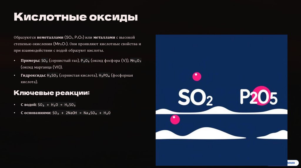 Кислотные оксидыОбразуются неметаллами (SO₂, P₂O₅) или металлами с высокой