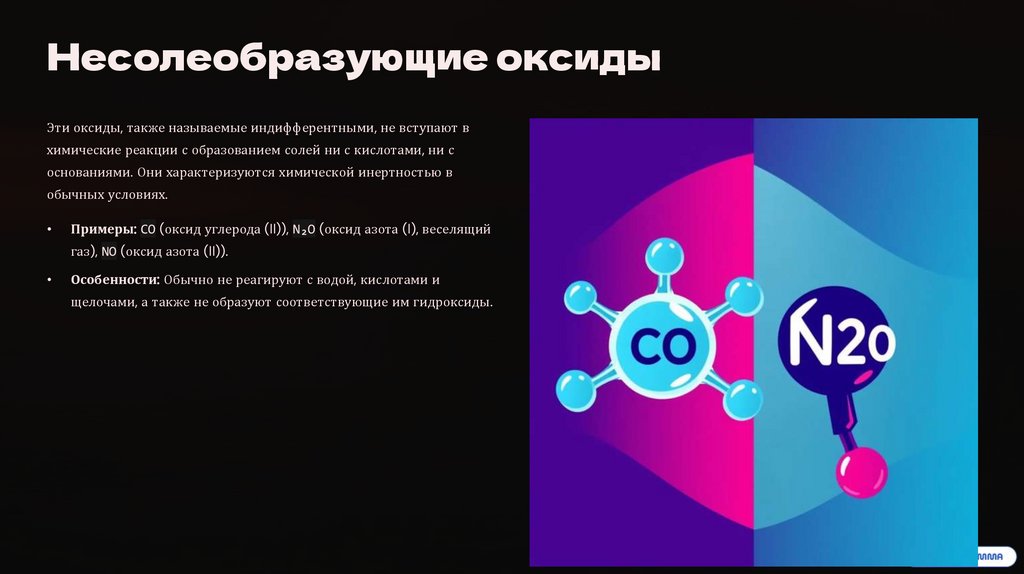 Несолеобразующие оксидыЭти оксиды, также называемые индифферентными, не вступают в