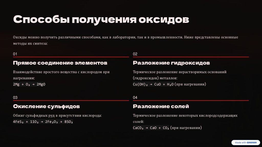 Способы получения оксидовОксиды можно получить различными способами, как в лаборатории, так и в промышленности. Ниже представлены основные