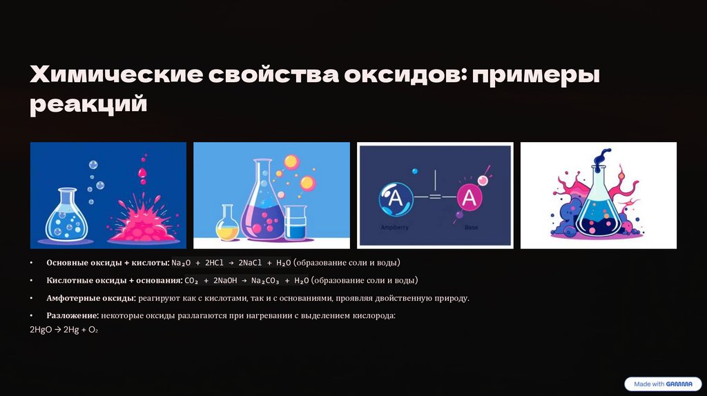 Амфотерные оксиды: реагируют как с кислотами, так и с основаниями, проявляя двойственную природу.