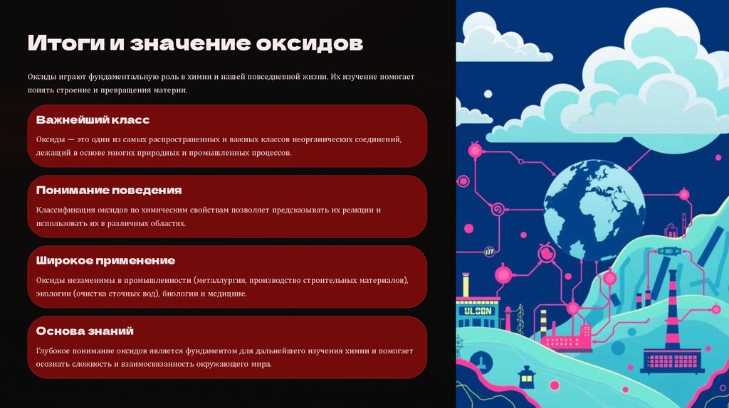 Итоги и значение оксидовОксиды играют фундаментальную роль в химии и нашей повседневной жизни. Их изучение помогает