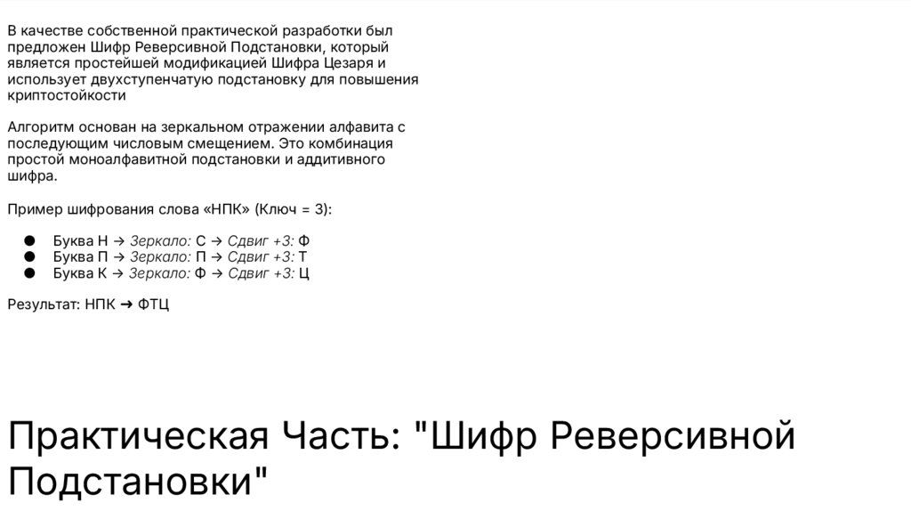 В качестве собственной практической разработки былпредложен Шифр Реверсивной Подстановки, который