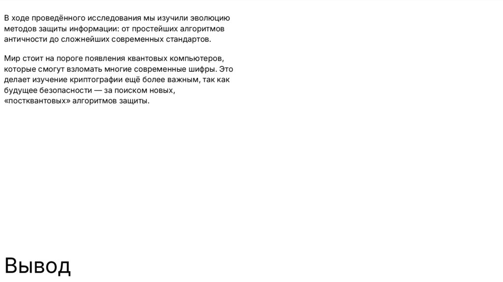 В ходе проведённого исследования мы изучили эволюциюметодов защиты информации: от простейших алгоритмов