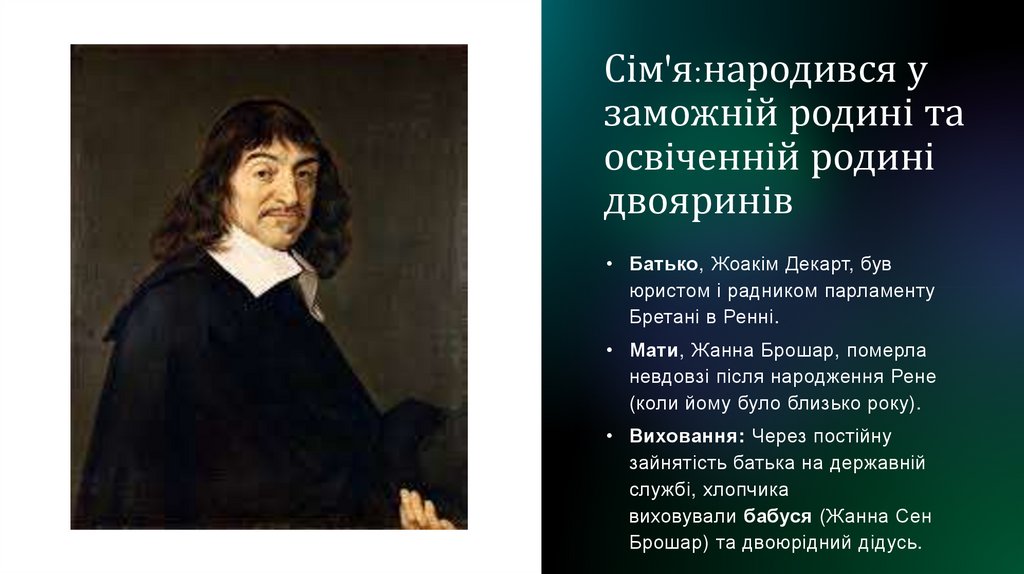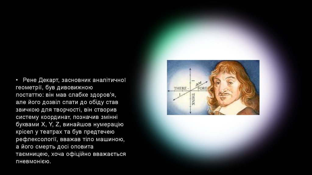 • Рене Декарт, засновник аналітичноїгеометрії, був дивовижною