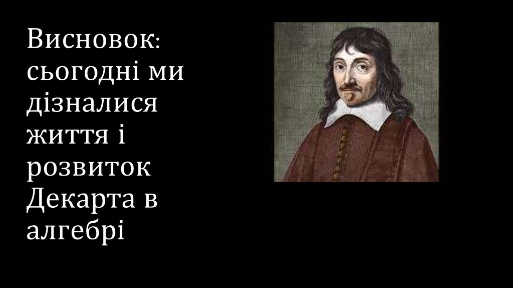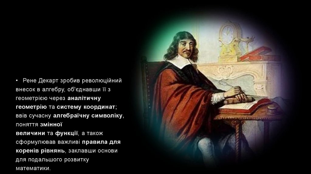 • Рене Декарт зробив революційнийвнесок в алгебру, об'єднавши її з