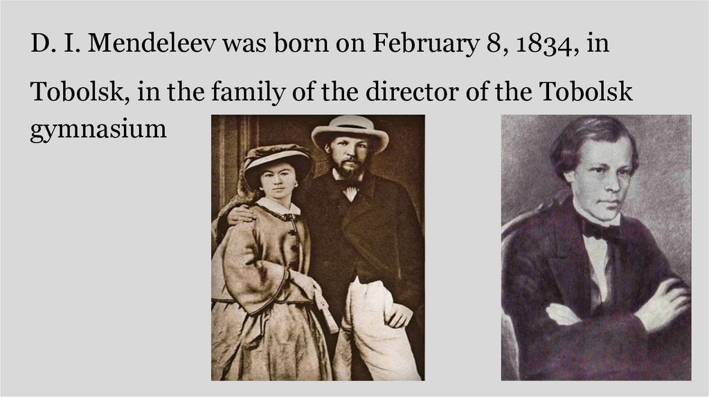D. I. Mendeleev was born on February 8, 1834, inTobolsk, in the family of the director of the Tobolsk