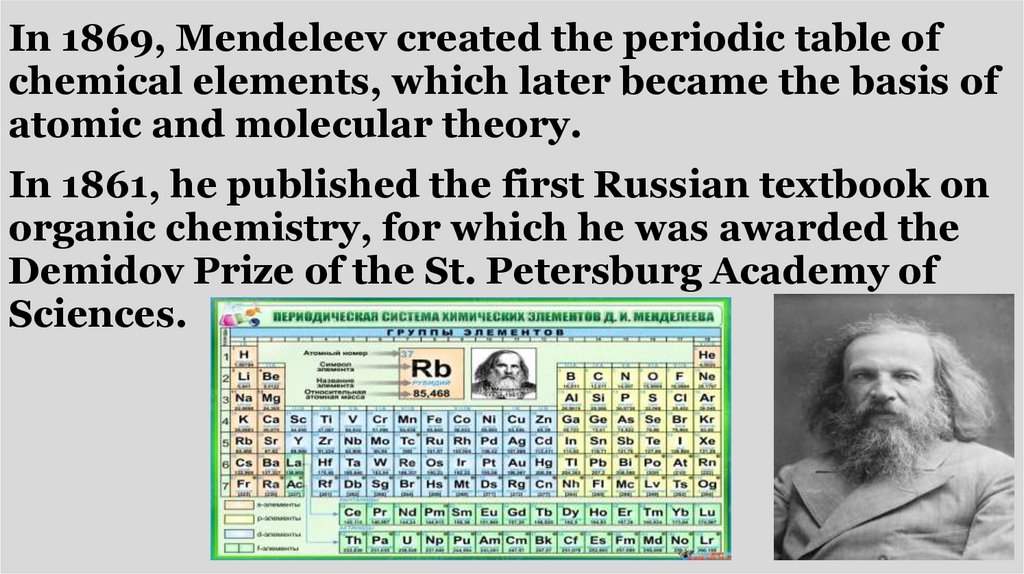 In 1869, Mendeleev created the periodic table ofchemical elements, which later became the basis of
