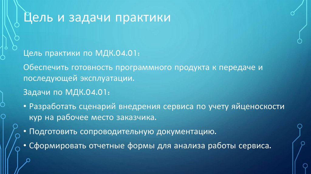 Цель и задачи практикиЦель практики по МДК.04.01: