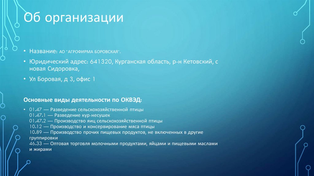 Об организации• Название: АО ”АГРОФИРМА БОРОВСКАЯ”.