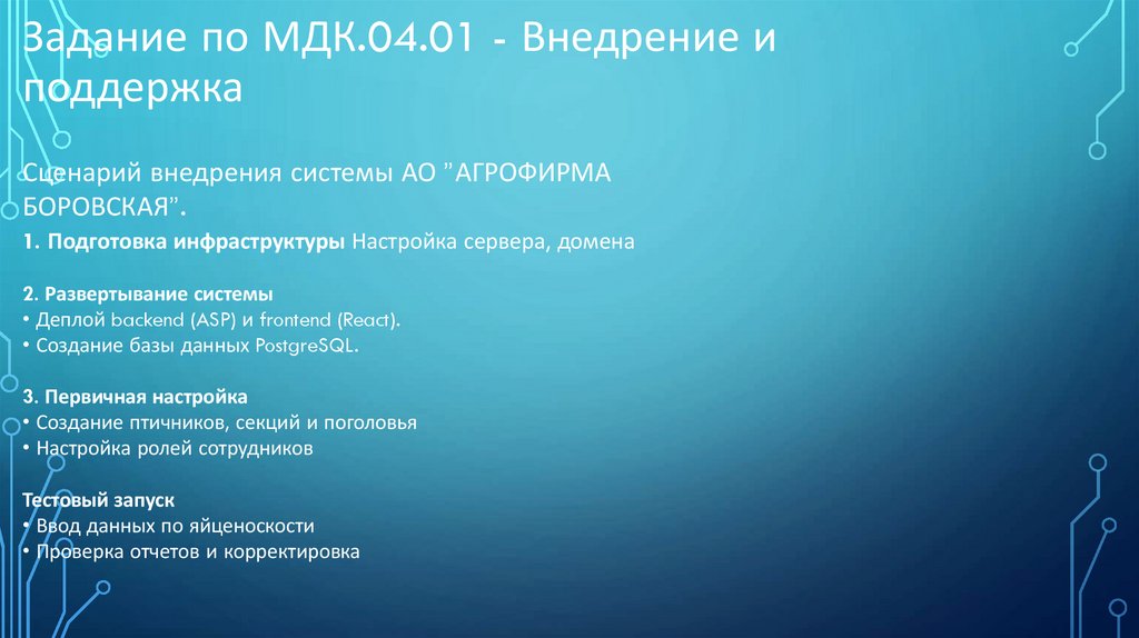 • Разработать сценарий внедрения сервиса по учету яйценоскости