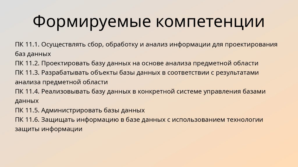 Формируемые компетенцииПК 11.1. Осуществлять сбор, обработку и анализ информации для проектирования