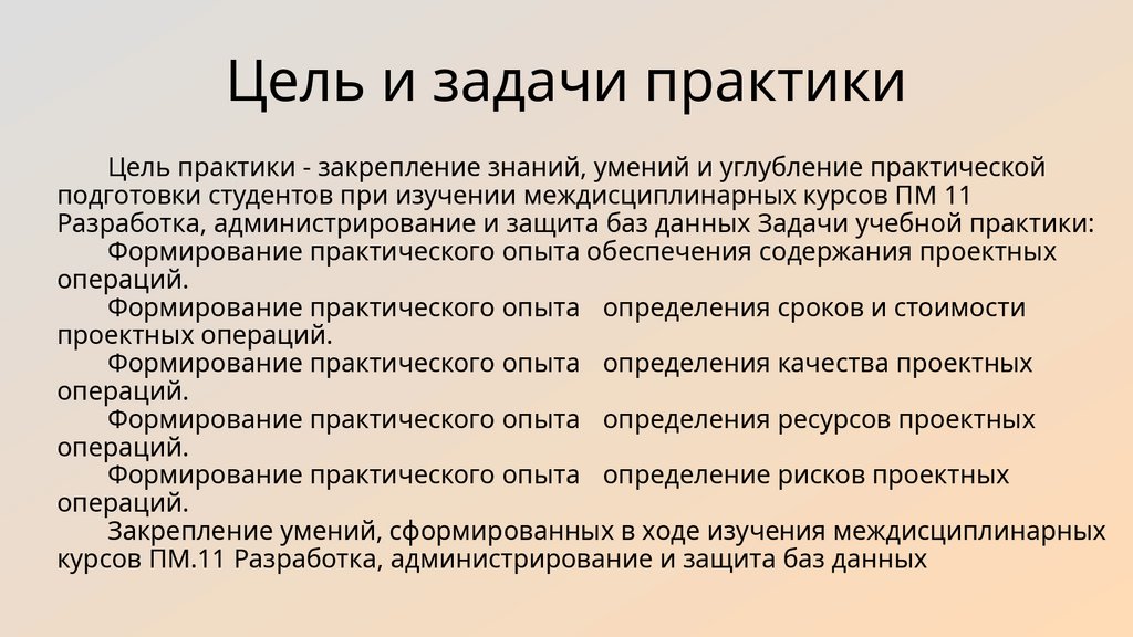 Цель и задачи практикиЦель практики - закрепление знаний, умений и углубление практической