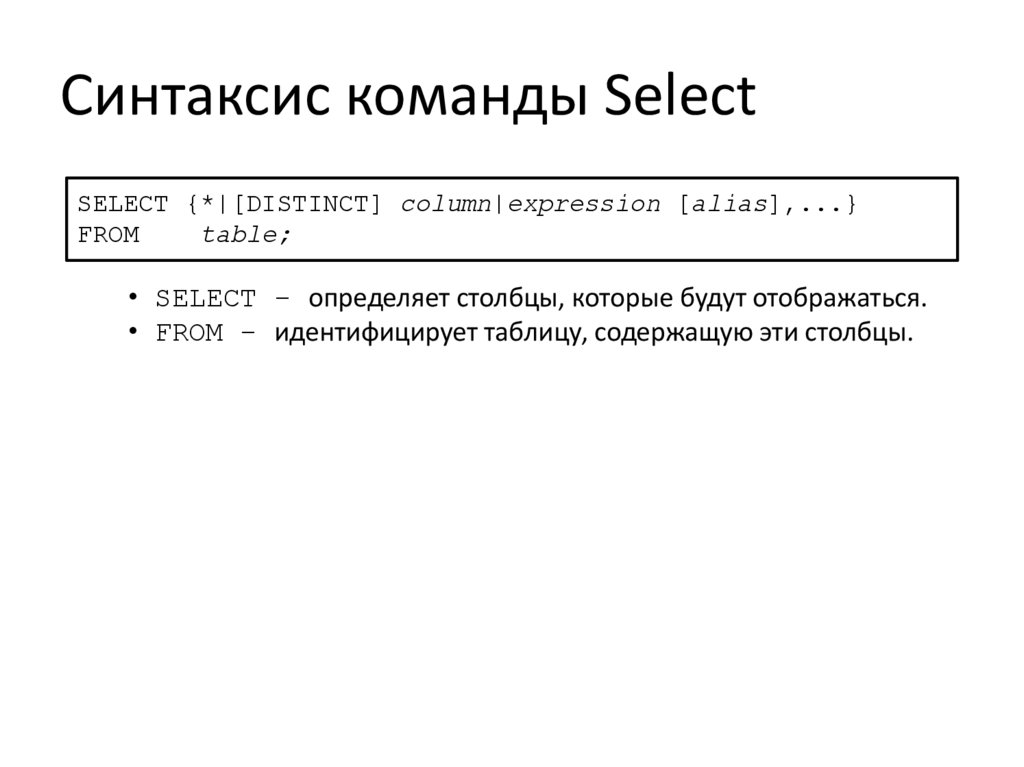 Синтаксис команды SelectSELECT {*|[DISTINCT] column|expression [alias],...}