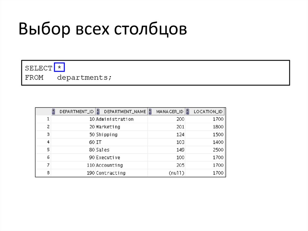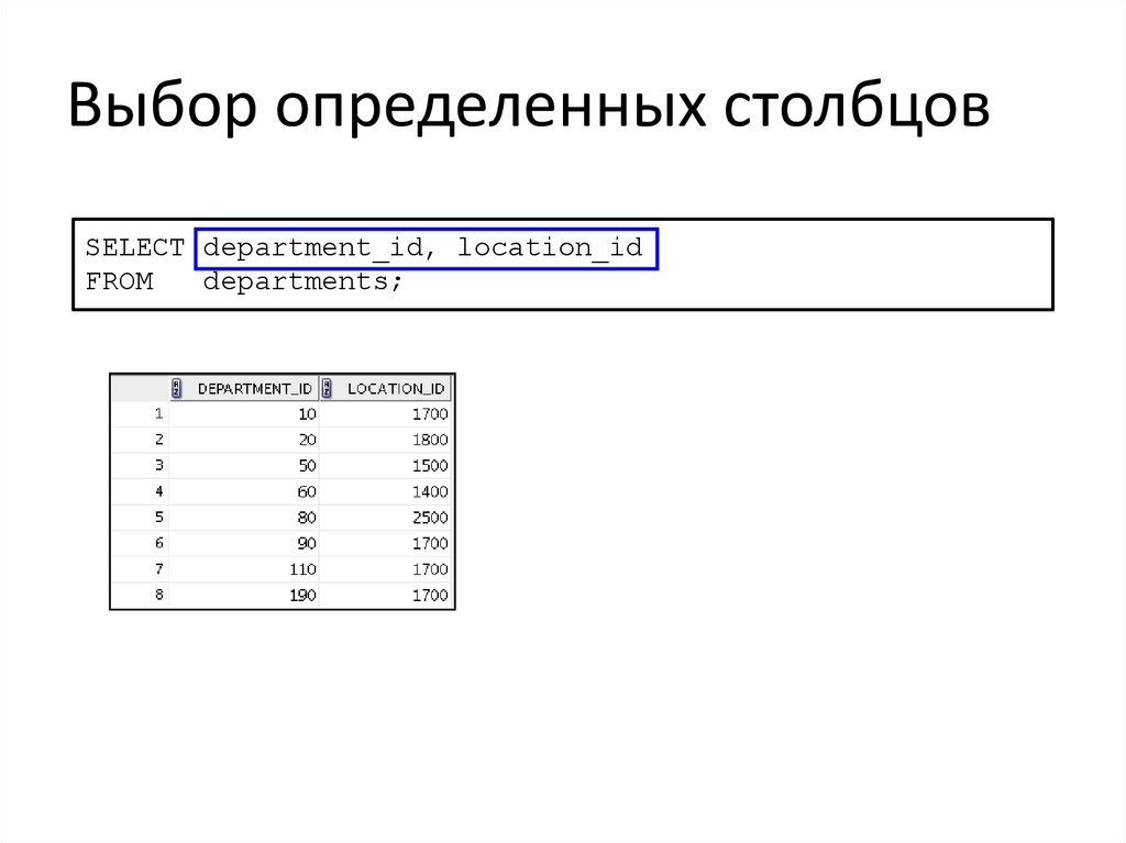 • FROM - идентифицирует таблицу, содержащую эти столбцы.