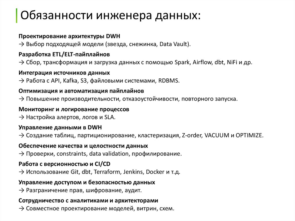 Обязанности инженера данных:Проектирование архитектуры DWH