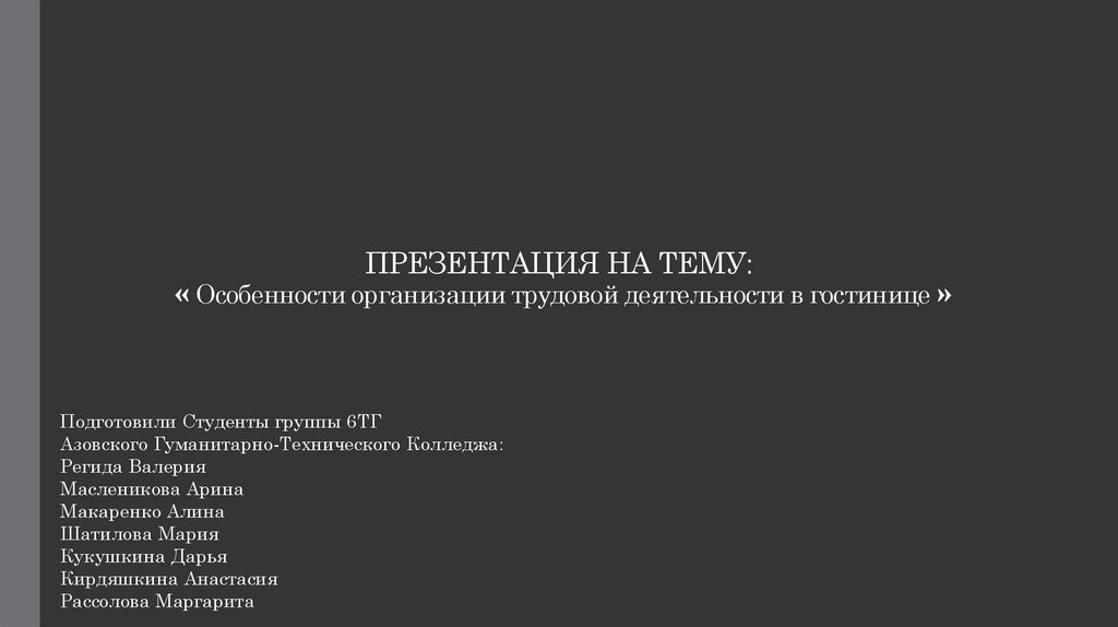 1. ПРЕЗЕНТАЦИЯ НА ТЕМУ: « Особенности организации трудовой деятельности в гостинице »