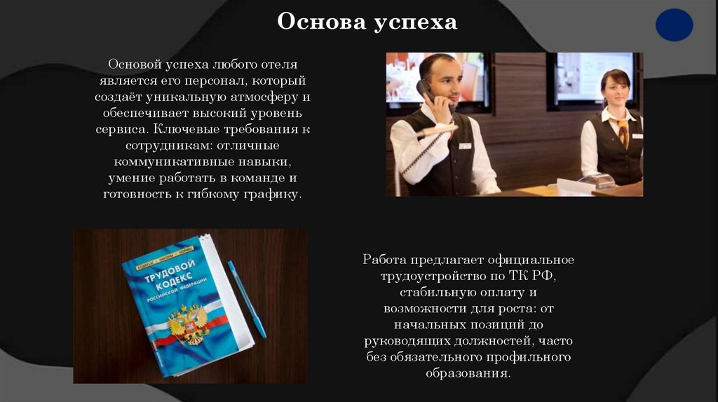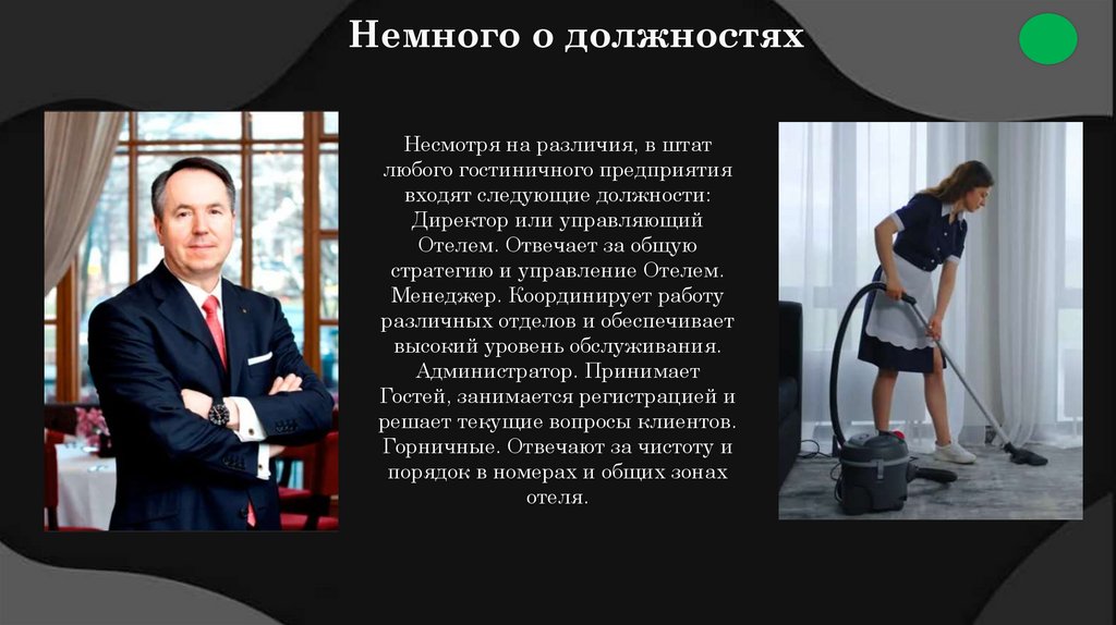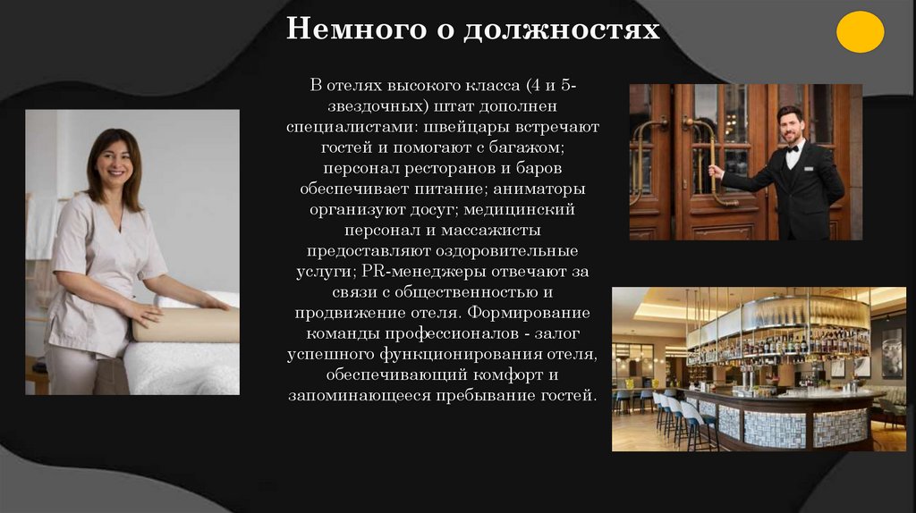 Немного о должностяхВ отелях высокого класса (4 и 5звездочных) штат дополнен