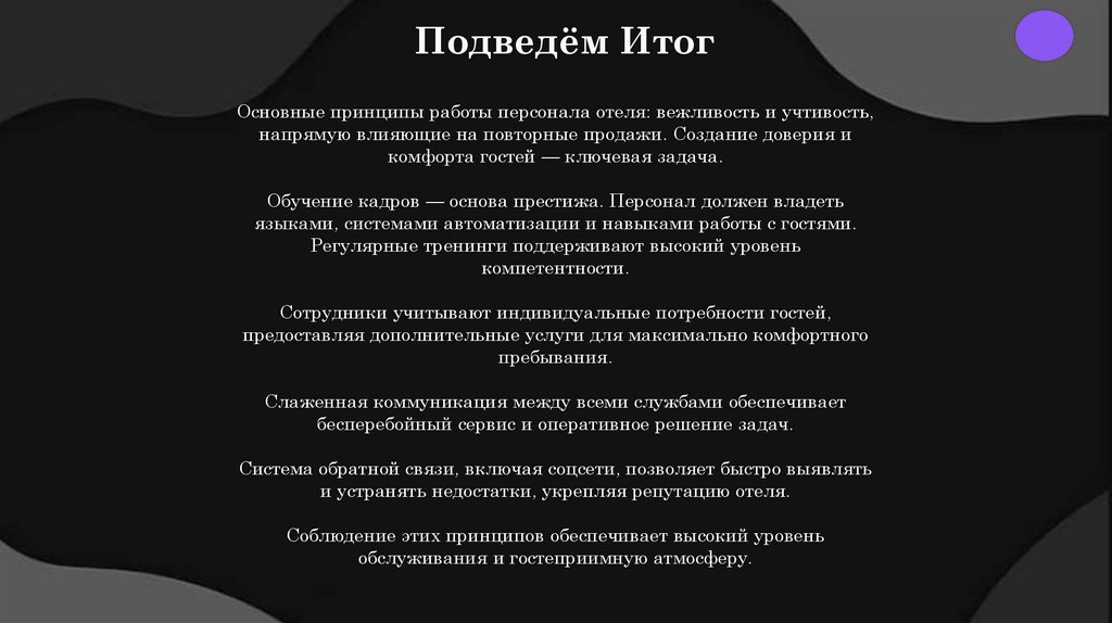 Подведём ИтогОсновные принципы работы персонала отеля: вежливость и учтивость,