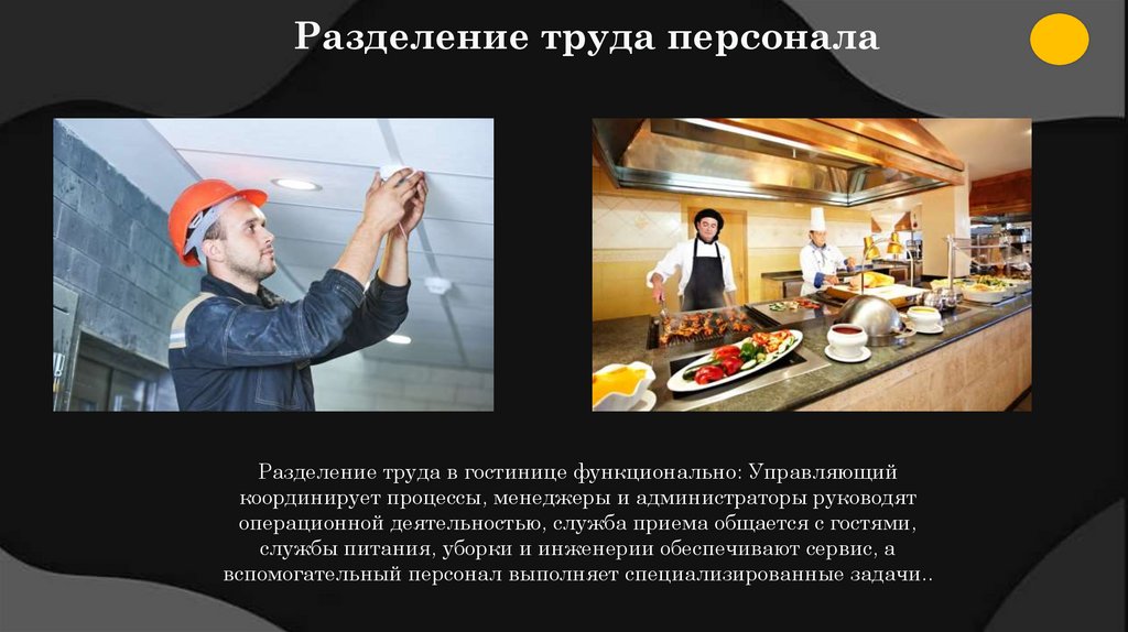 Разделение труда персоналаРазделение труда в гостинице функционально: Управляющий