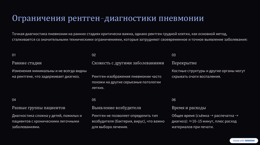 Ограничения рентген-диагностики пневмонииТочная диагностика пневмонии на ранних стадиях критически важна, однако рентген грудной клетки, как основной метод,