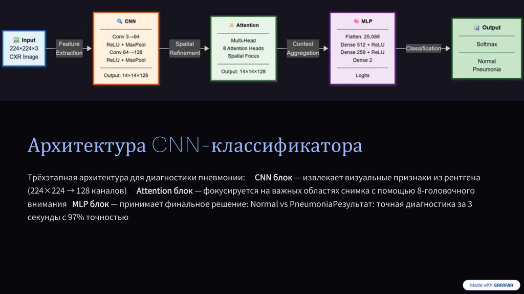 Архитектура CNN-классификатораТрёхэтапная архитектура для диагностики пневмонии: