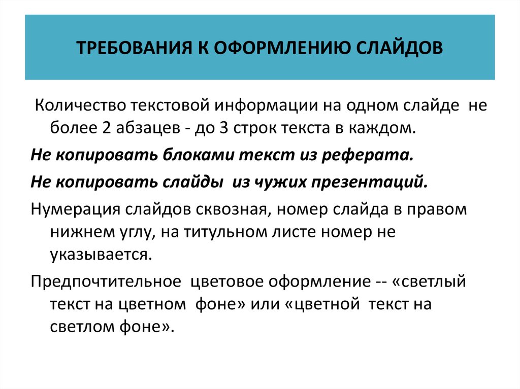 ТРЕБОВАНИЯ К ОФОРМЛЕНИЮ СЛАЙДОВКоличество текстовой информации на одном слайде не