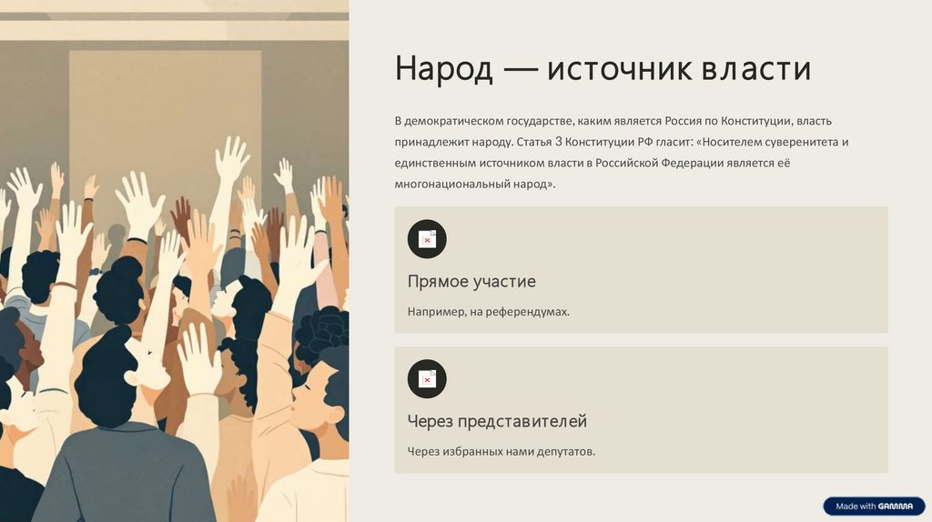 Народ — источник вл астиВ демократическом государстве, каким является Россия по Конституции, власть