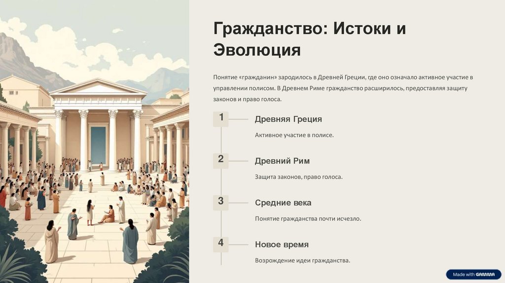 Понятие «гражданин» зародилось в Древней Греции, где оно означало активное участие в