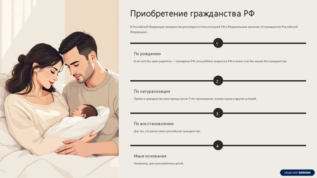 Приобретение гражданства РФВ Российской Федерации гражданство регулируется Конституцией РФ и Федеральным законом «О гражданстве Российской